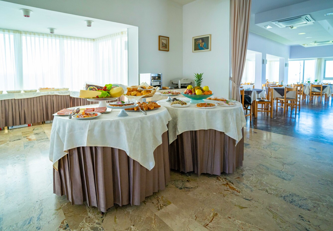 I clienti potranno consumare i pasti nella luminosa e climatizzata sala ristorante dotata di ampie vetrate con vista sul mare: un’abbondante colazione a buffet con prodotti dolci e salati è il modo migliore per iniziare la giornata mentre, sia a pranzo che a cena, gli ospiti potranno gustare i piatti tradizionali della cucina regionale e mediterranea accompagnati da verdure; i pasti termineranno con dei gustosi dolci per la gioia dei più piccoli.
