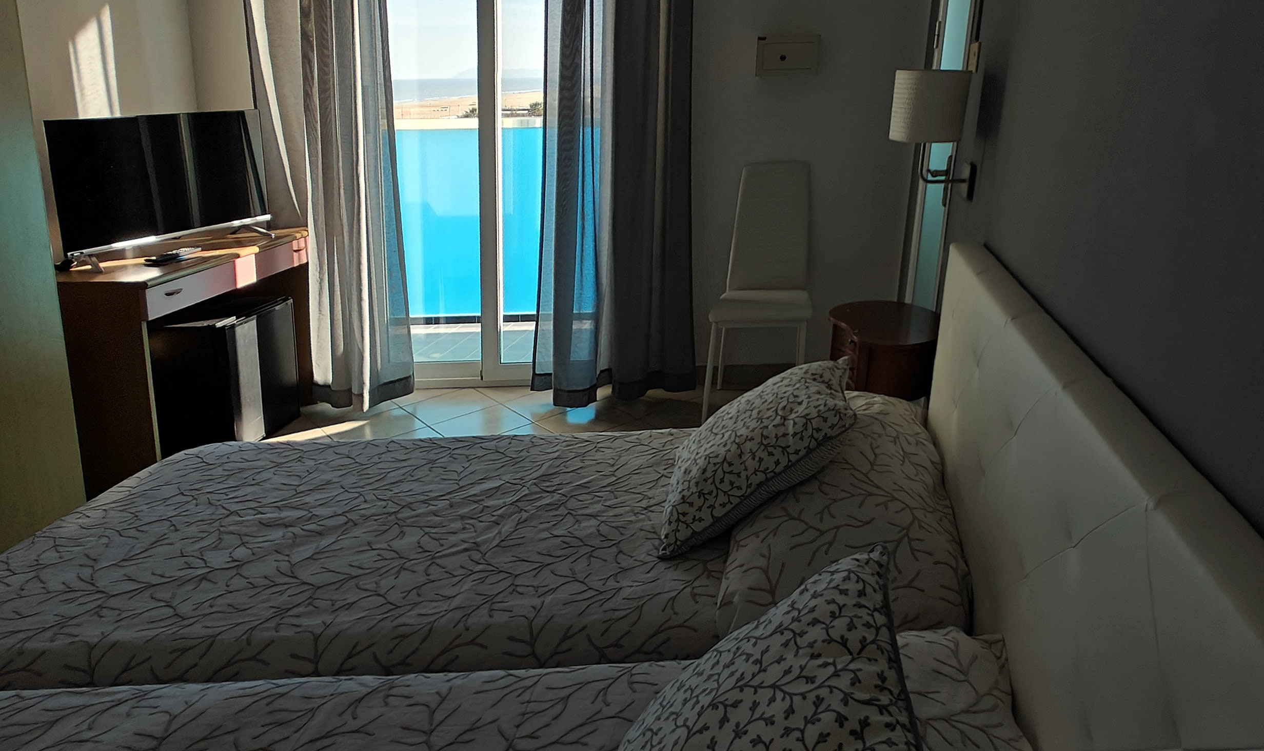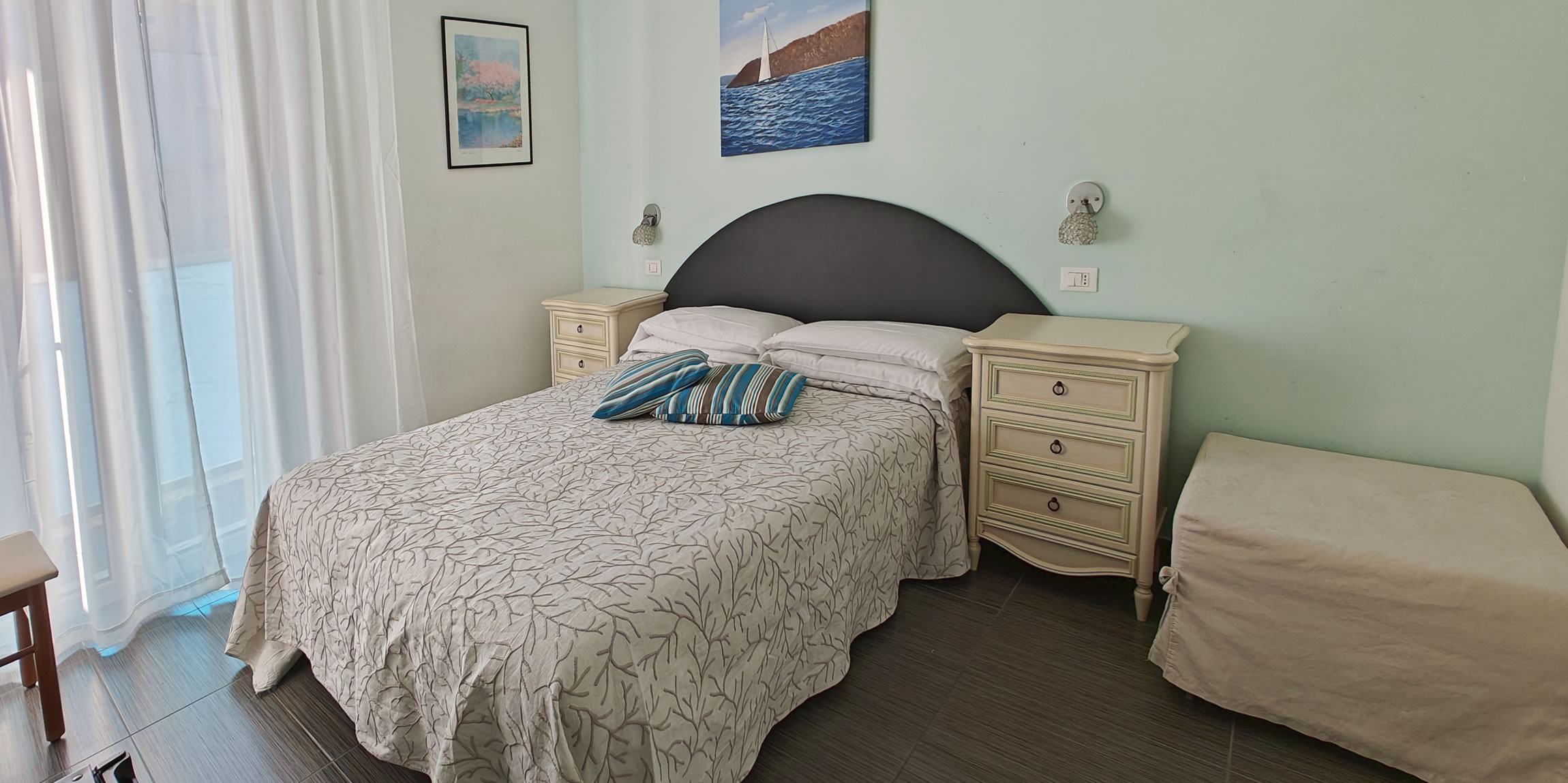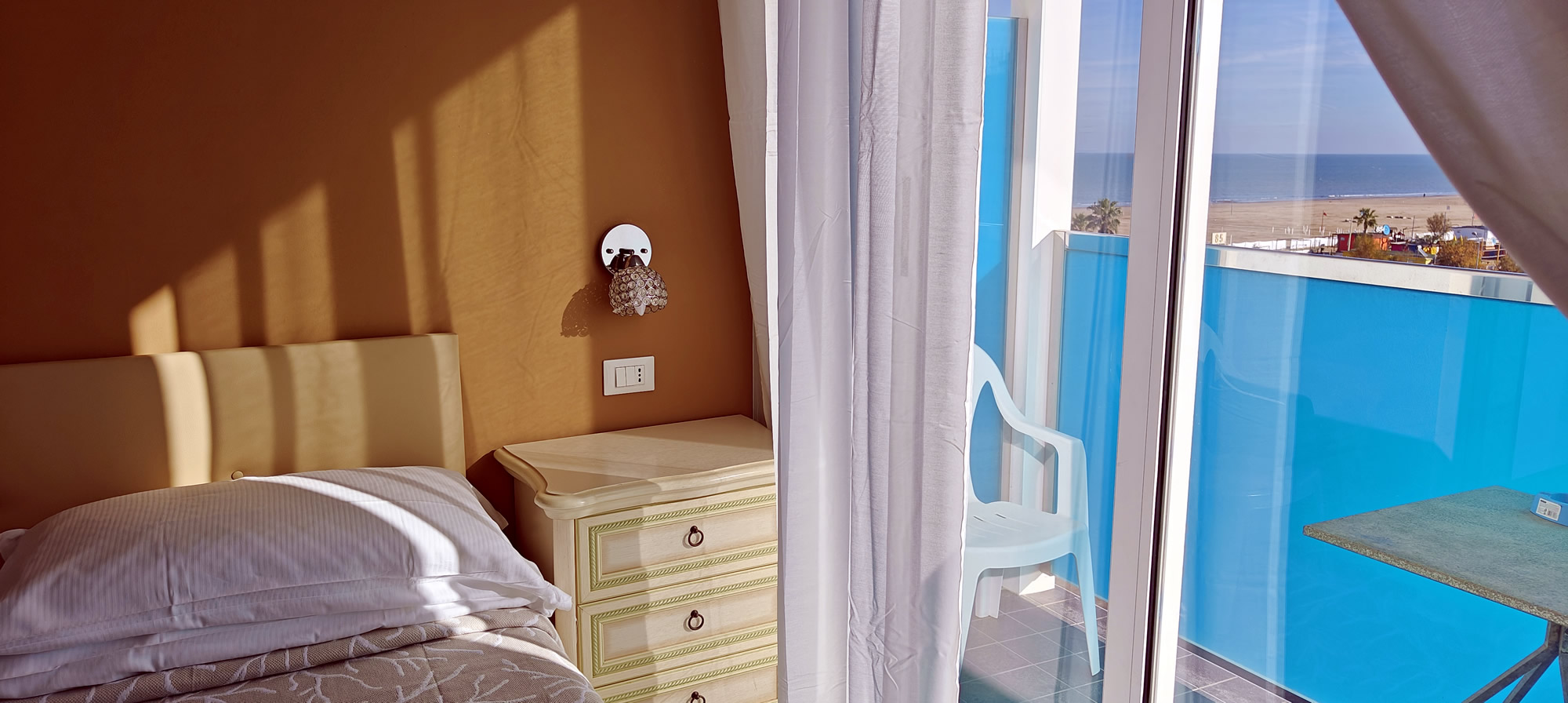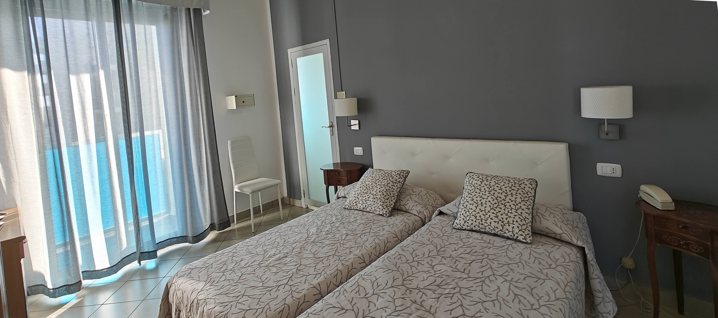 CAMERE: confortevoli camere arredate in stile classico o in stile moderno, sono tutte rinnovate e dotate di servizi, anch\'essi rinnovati, con box doccia, aria condizionata, telefono diretto, cassaforte, televisione Lcd con antenna satellitare e canali stranieri, frigobar, connessione internet wi-fi, asciugacapelli ed un balcone con una meravigliosa vista sul mare.