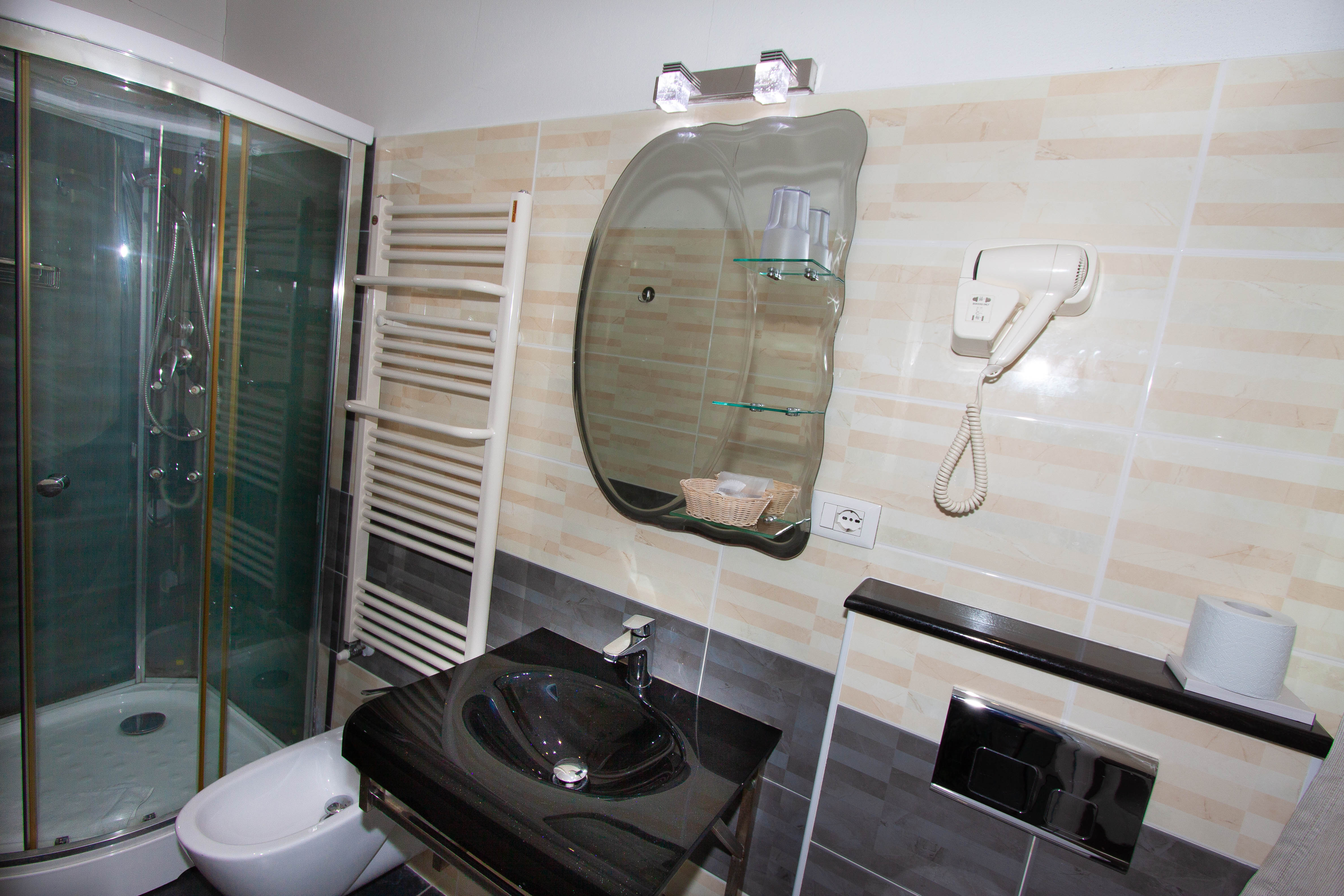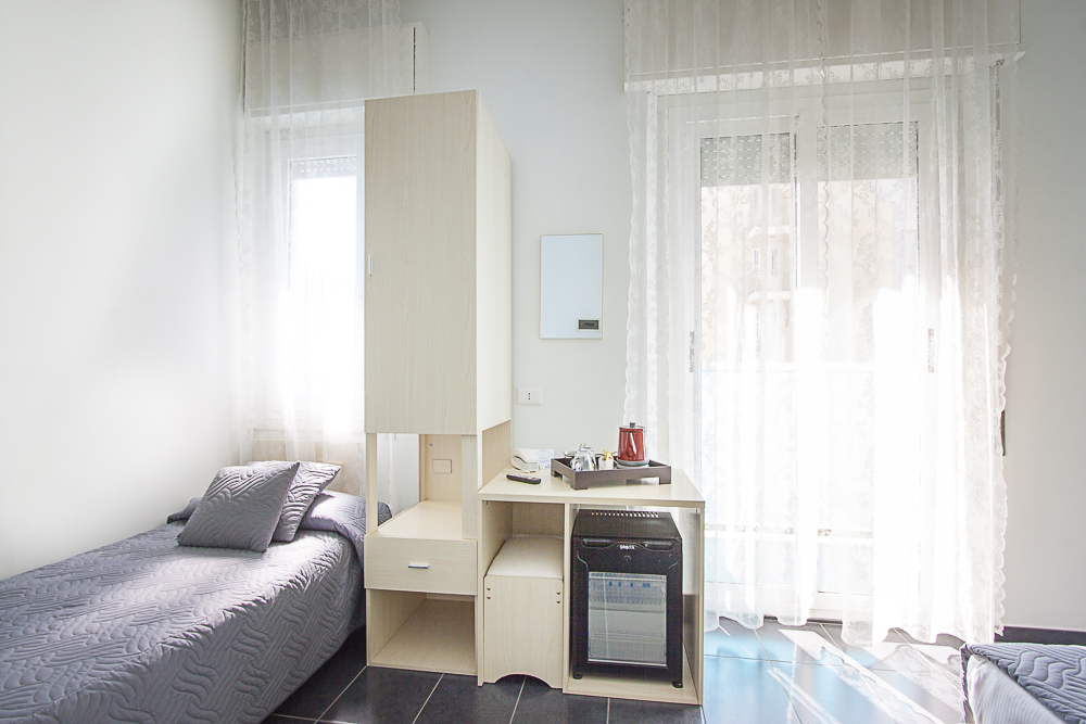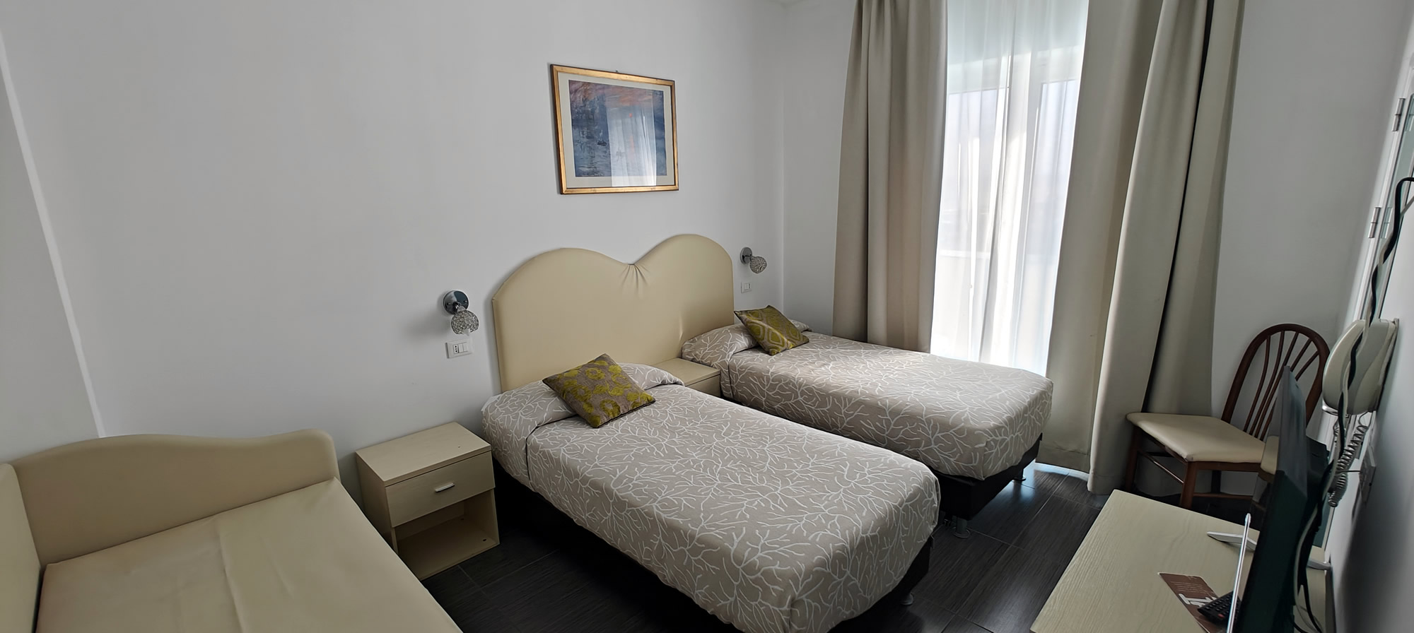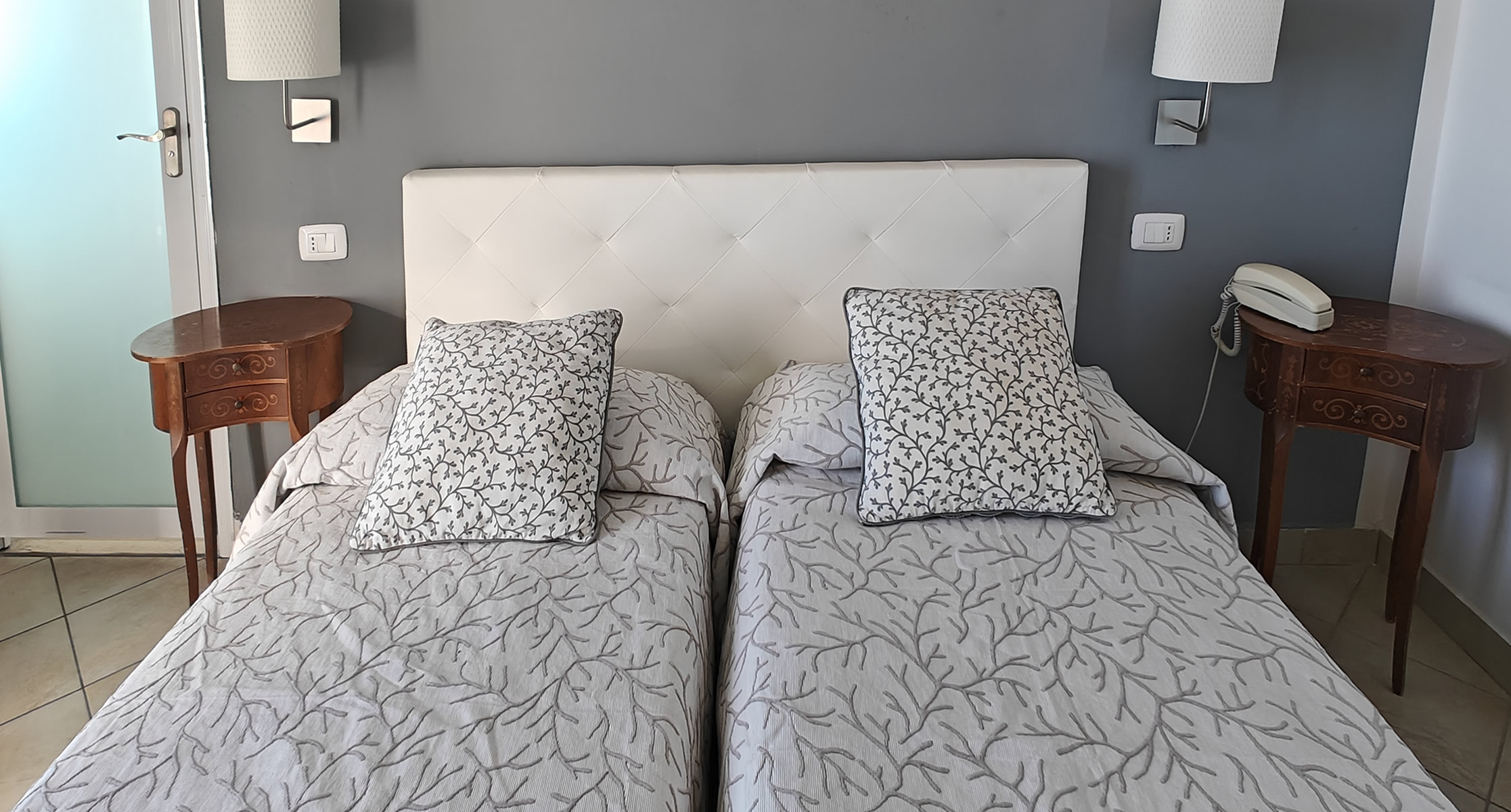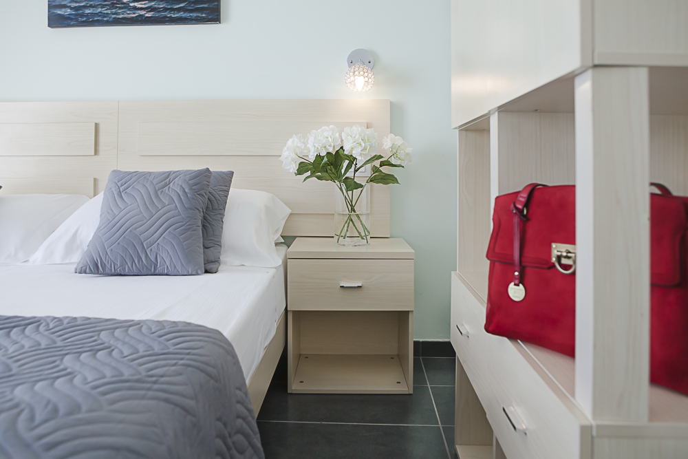 CAMERE: confortevoli camere arredate in stile classico o in stile moderno, sono tutte rinnovate e dotate di servizi, anch\'essi rinnovati, con box doccia, aria condizionata, telefono diretto, cassaforte, televisione Lcd con antenna satellitare e canali stranieri, frigobar, connessione internet wi-fi, asciugacapelli ed un balcone con una meravigliosa vista sul mare.