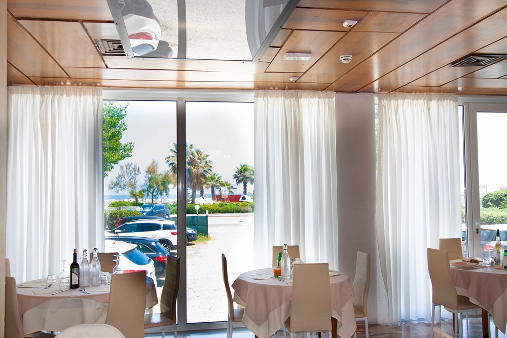 Posti auto recintati, un giardino ombreggiato da pini marittimi secolari ed il ristorante Vistamare, uno dei fiori all’occhiello della struttura alberghiera. Qui infatti vengono serviti i pasti e la colazione.
